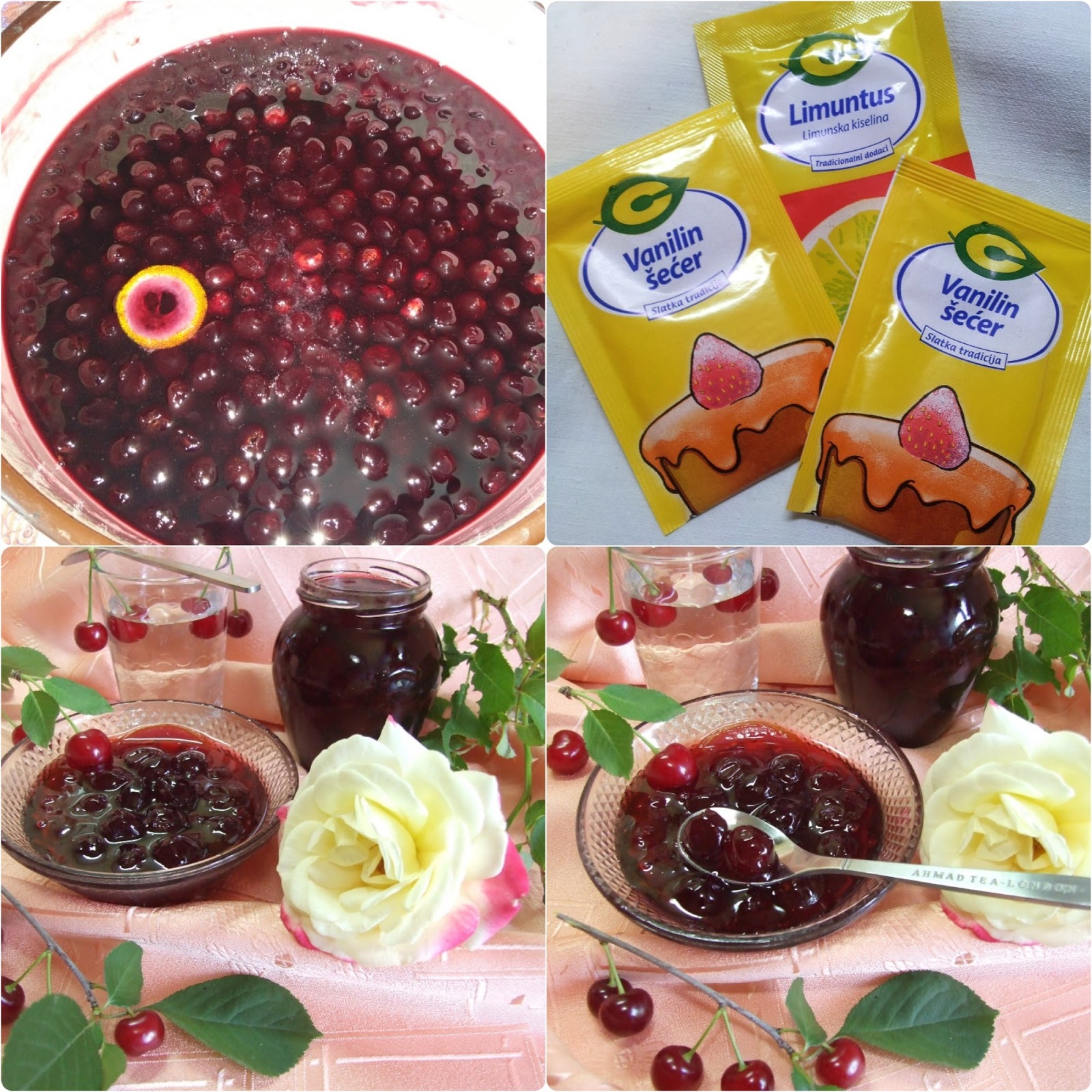 Ušpinovati dobro šećer sa 1 dl. vode pa dodati očišćene višnje. Posuti po višnjama limuntus i vanilin šećer. Kuvati oko 30 min. tokom kuvanja sklanjati penu.